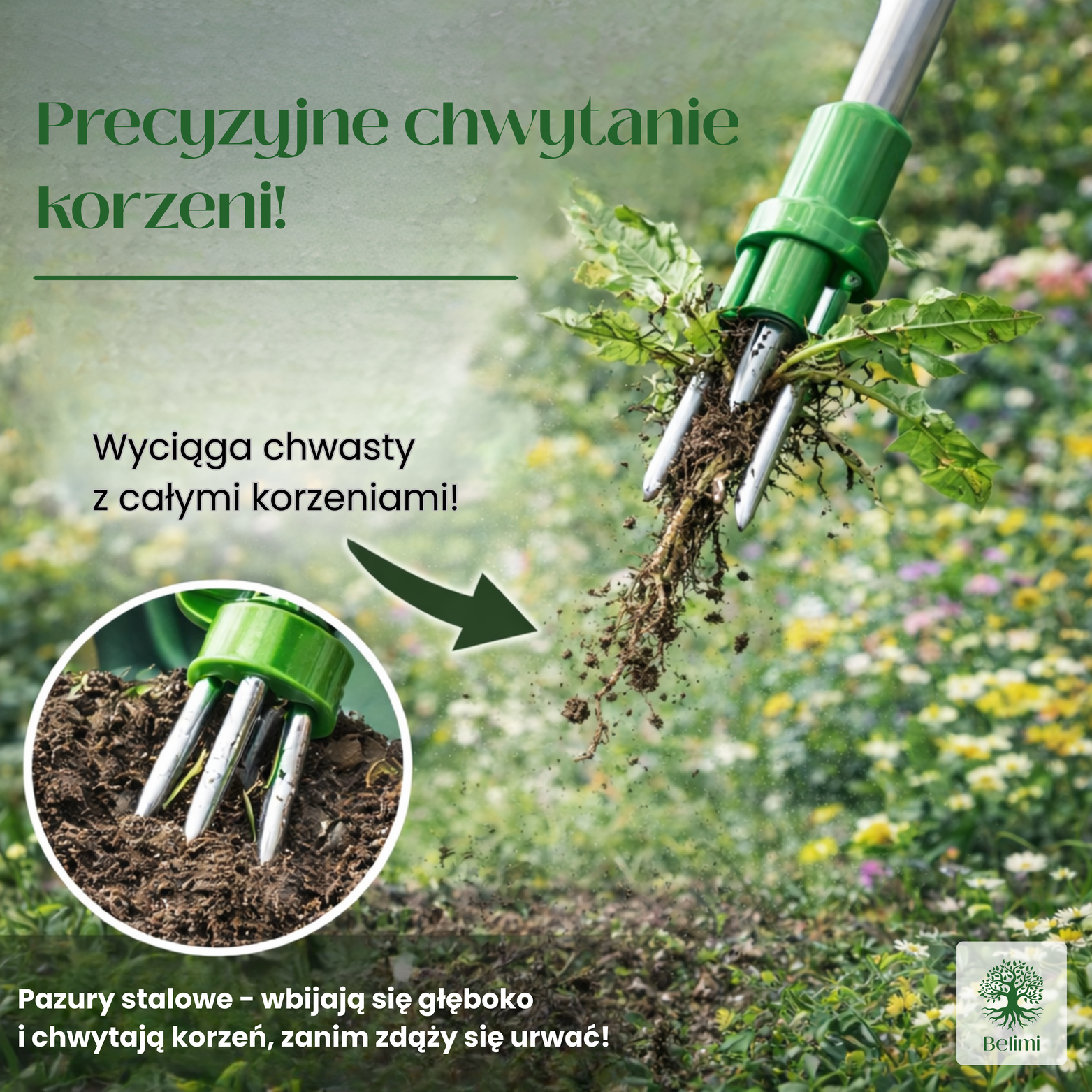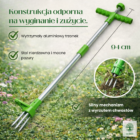 Specjalna końcówka wbija się w ziemię i chwyta korzeń chwastu.