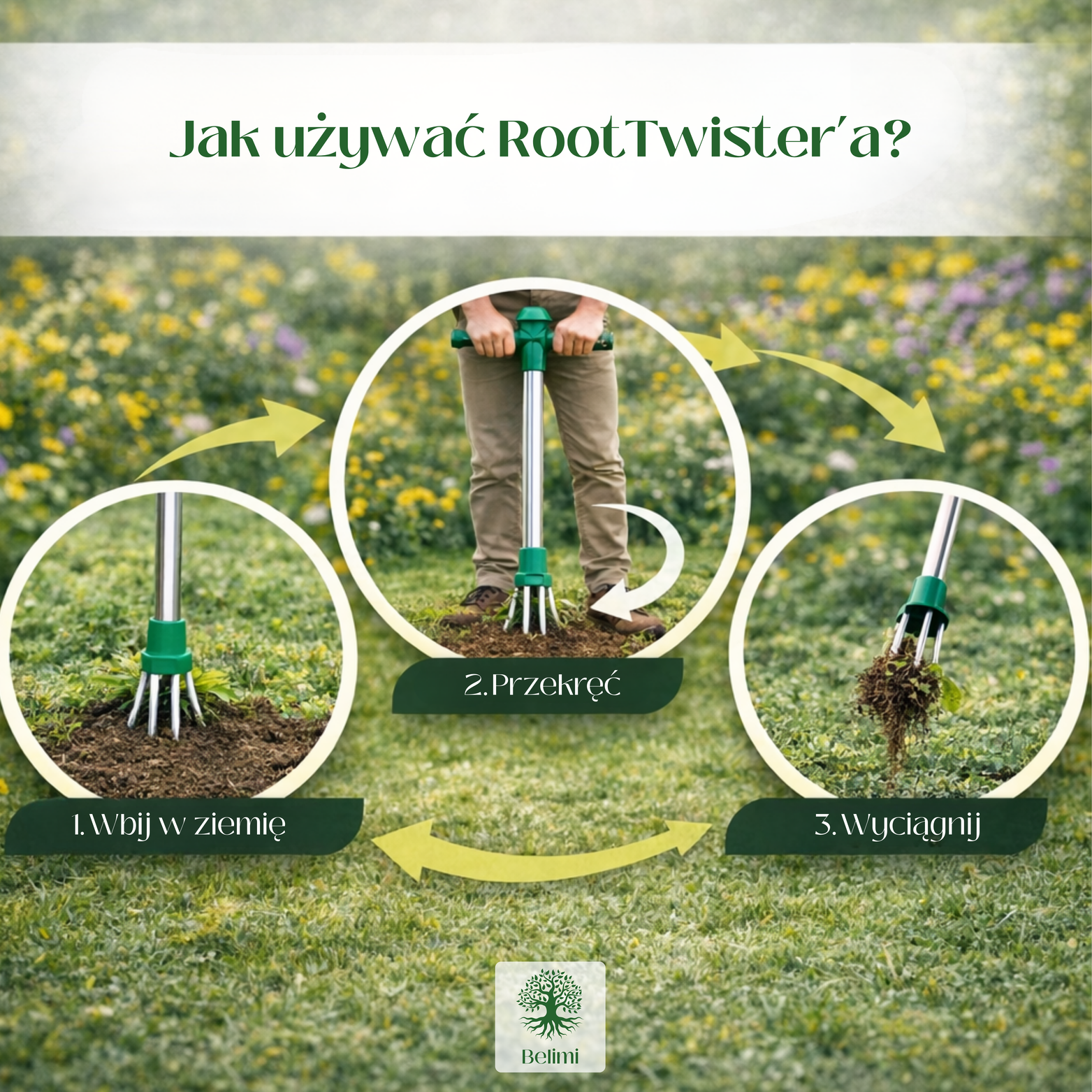 RootTwister PRO to narzędzie ogrodowe do skutecznego usuwania chwastów razem z korzeniami. Dzięki specjalnej końcówce wystarczy wbić narzędzie w ziemię, lekko przekręcić i wyciągnąć chwast bez wysiłku.